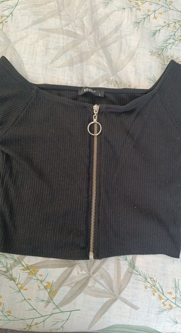 Sentetik kumaştan yapılmış, kısa kollu ve bisiklet yakalı, önünde fermuar bulunan siyah dar kesim bluz. Günlük sokak tarzı için uygundur.