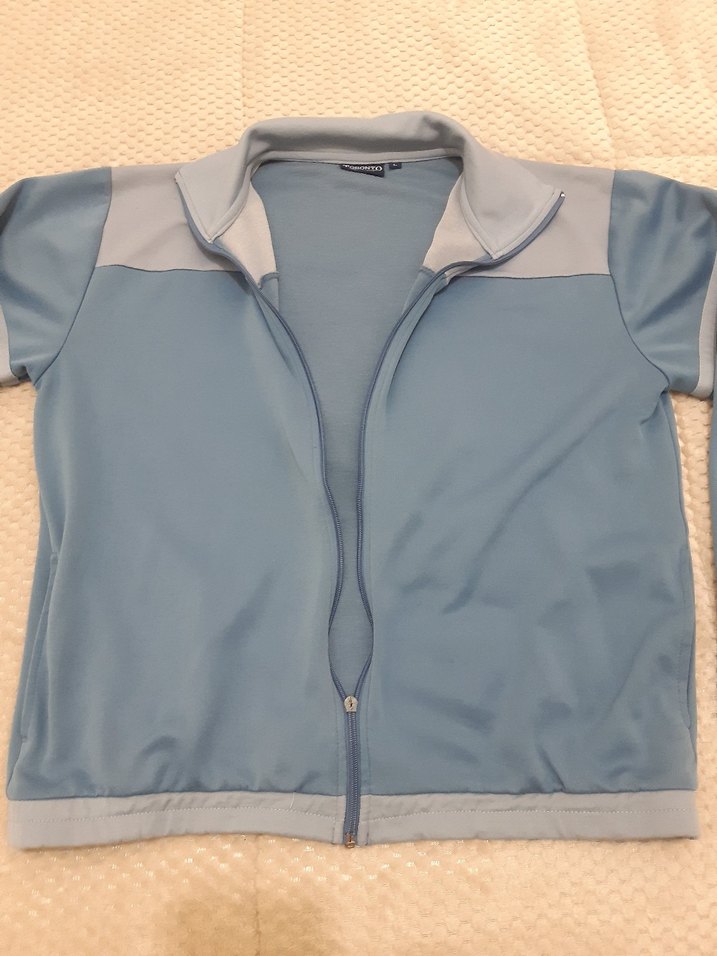 Fermuarlı, uzun kollu ve bisiklet yaka olan bu mavi spor unisex ceketi, yumuşak kumaştan yapılmıştır ve günlük rahat kullanıma uygundur. sadece fermuar başlığı kırıktır fermuarın kendisi sağlamdır.