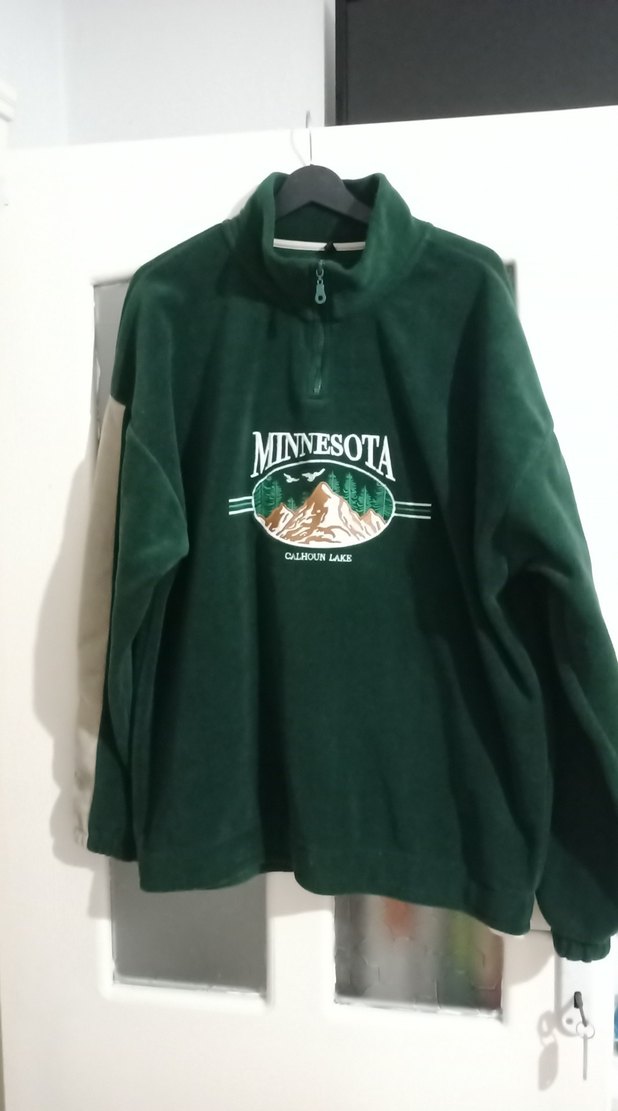 Uzun kollu, fermuarlı yakaya sahip koyu yeşil sweatshirt. Önünde Minnesota baskısı bulunur, yumuşak ve sıcak kumaştan, dış mekan kullanımı için uygundur. ️