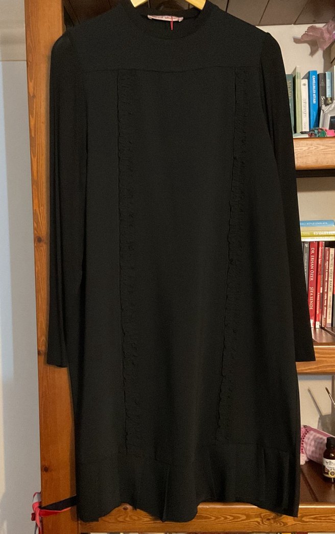 Uzun Kollu Fırfır ve Pile Detaylı Kadın Elbise