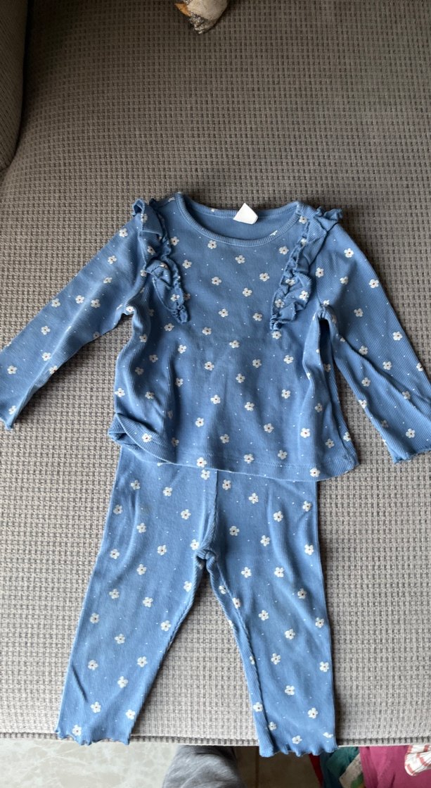 Uzun kollu ve fırfırlı detaylara sahip, yumuşak mavi kumaştan bebek kız takımı. Üst ve uyumlu pantolondan oluşur. 9 12 ay kusursuz