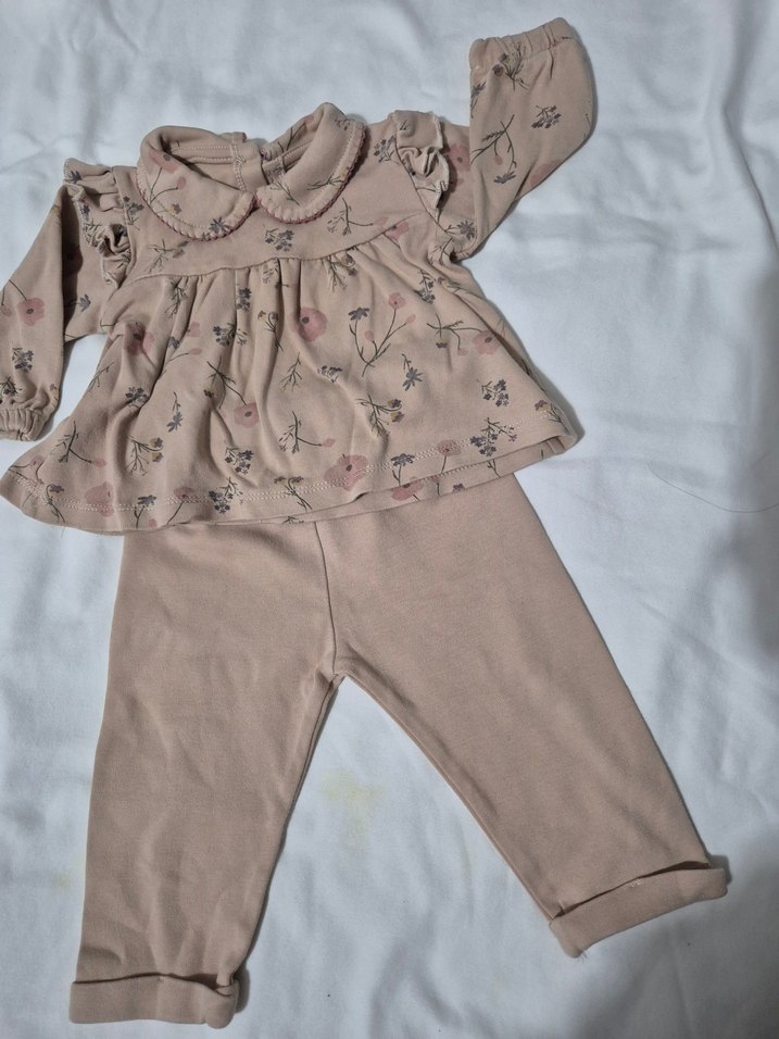 Uzun kollu, fırfırlı detaylı yakalı üst ve sade bej pantolondan oluşan bebek kız takımı. Pastel bej rengiyle yumuşak bir görünüm sunar.