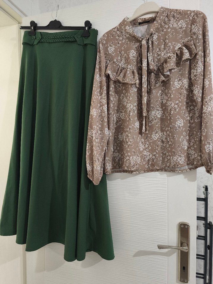 Uzun kollu, yüksek yakalı, fırfırlı ve bol kesim bej bluz. Yumuşak sentetik kumaştan üretilmiştir, ofis kullanımı için uygundur.