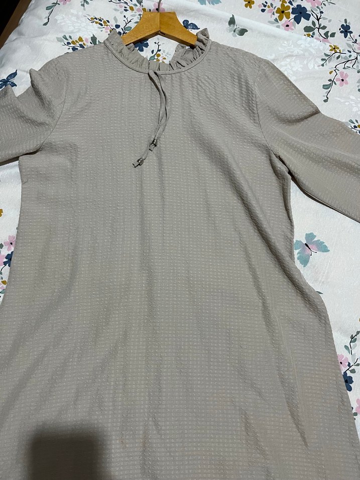Yumuşak keten kumaştan, uzun kollu, yüksek yakalı ve fırfırlı detaylı bol kesim bej tunik, günlük rahat sokak stili için uygundur.