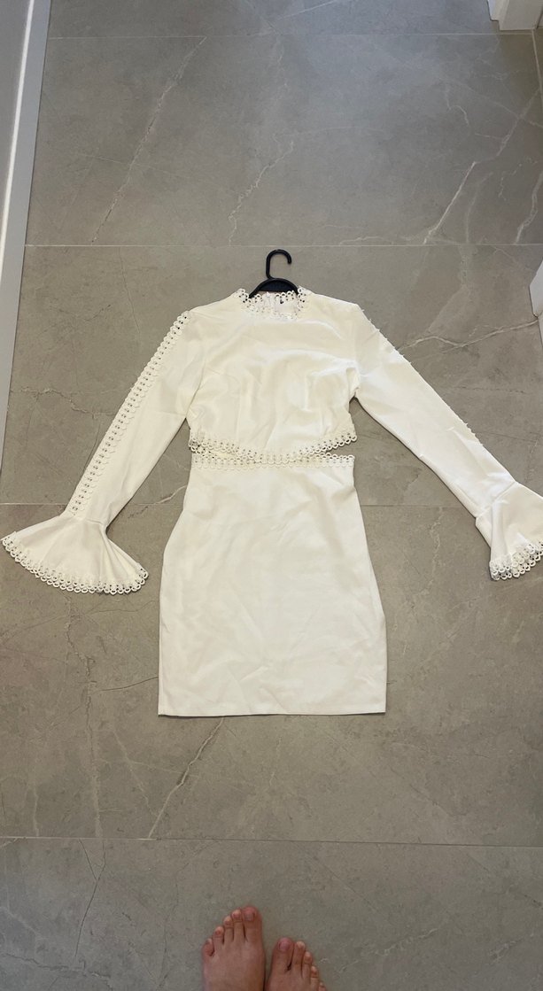 Uzun Kollu Fırfırlı Beyaz Midi Elbise