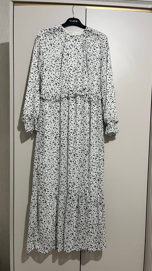 Gri batik desenli, yüksek yakalı ve fırfırlı detaylı uzun kollu, bol kesim uzun elbisedir. Herhangi bir defo bulunmamaktadır. Şifona benzer bir kumaş efil efil yazlık elbise.