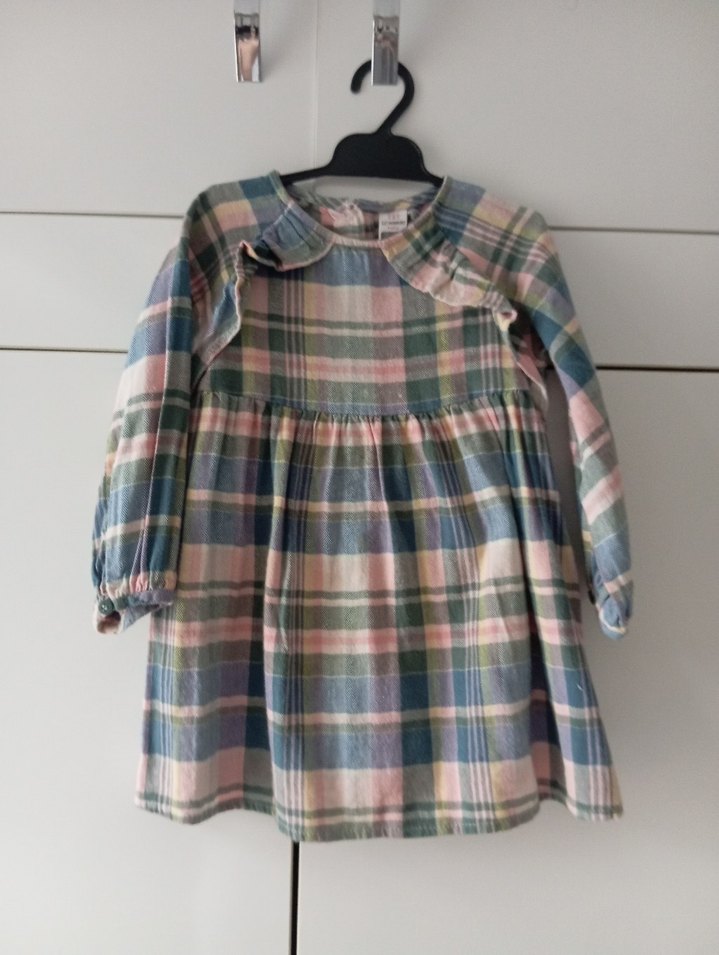 Sentetik kumaştan yapılmış, yakalı, uzun kollu ve bol kesim kız elbisesi. Çok renkli pastel ekose deseni ve fırfır detaylarıyla bohem tarzda.