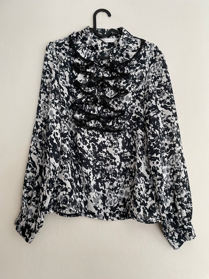 Uzun kollu, fırfırlı ve yüksek yakalı gri desenli bluz, bol kesim ve midi boyda. Ofis için uygun.
