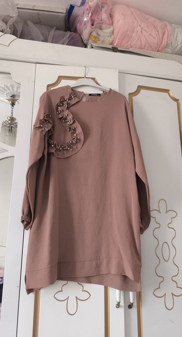 Bol kesim, uzun kollu, yuvarlak yakalı tunik. Göğüs kısmında fırfır detaylı. Yumuşak keten kumaştan, pastel bej tonunda. Nakışlı deseniyle sade bir doku katıyor. Günlük kullanıma uygun.
