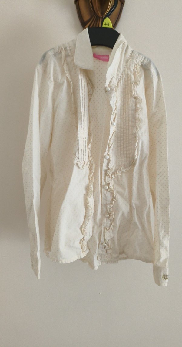Uzun kollu, yakalı ve ön kısmında fırfır detayları bulunan beyaz keten gömlek.