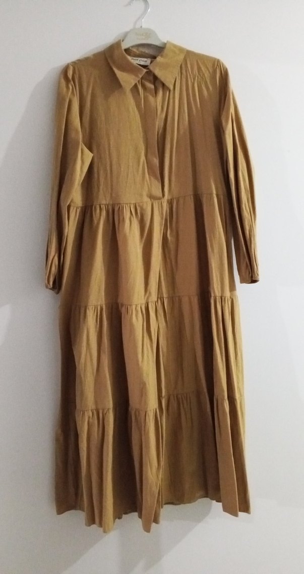Hardal renkte, keten kumaştan uzun boy, yakalı ve fırfırlı detaylara sahip, bol kesim ve uzun kollu bohem tarz elbise.