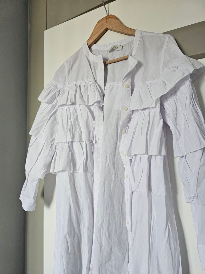 Yumuşak keten kumaştan üretilmiş, uzun ve bol kesim gömlek, yakalı ve katmanlı fırfır detaylarıyla bohem ve Paris tarzını yansıtıyor.