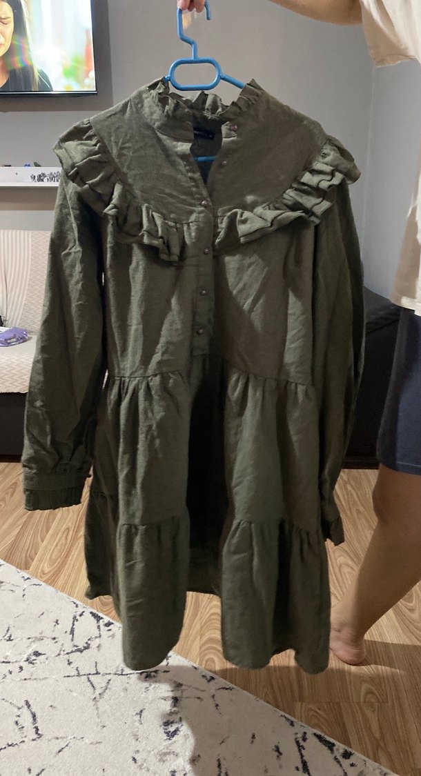 Uzun, bol kesim kadın elbisesi yüksek yakalı ve fırfır detaylıdır. Yumuşak keten kumaştan, koyu haki renkte, günlük kullanıma uygun rahat sokak stili sunar.