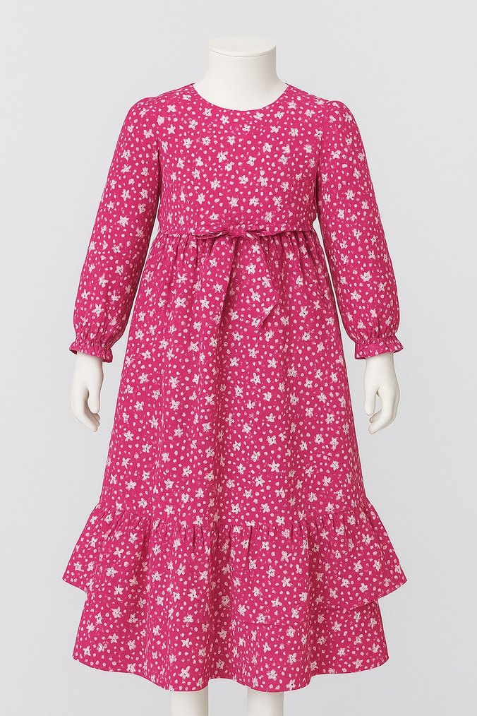 Uzun kollu, fırfırlı detaylı, bol kesim kız çocuk elbisesi. Canlı pembe çiçek desenli, yuvarlak yakalı ve yumuşak viskon kumaştan üretilmiştir.