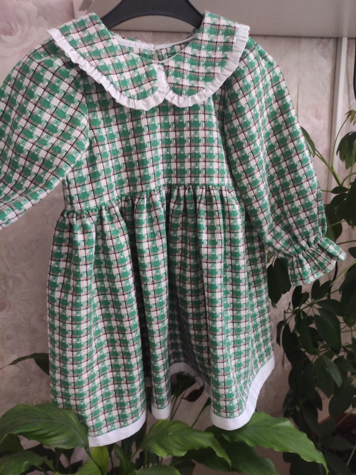 Yeşil ve gri kare desenli, nakışlı, uzun kollu, yakalı ve bol kesim kız elbisesi, fırfır detaylı. Ürünü kendim diktim istege göre sipariş alınır dikilir