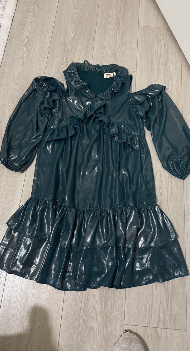 Uzun, koyu mavi renkte kadın elbisesi, fırfır detayları ve bol kesimi ile dikkat çeker. Askısız yaka ve batik desen, şık bir gotik tarz sunar.