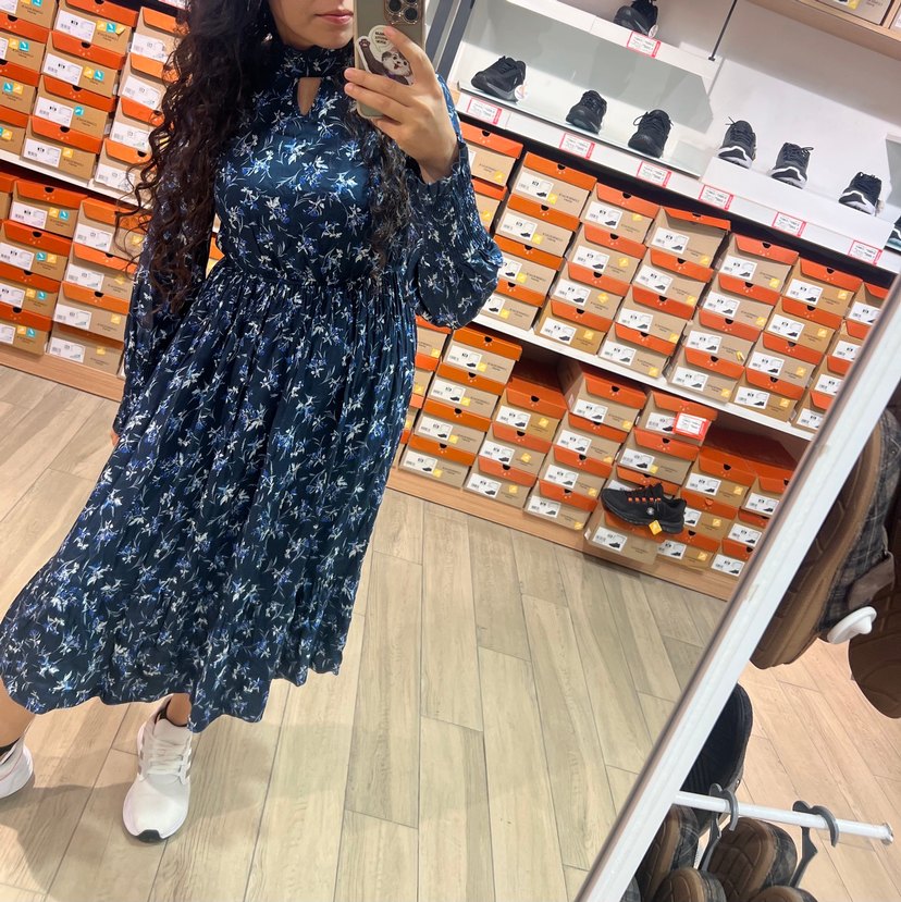 Uzun, bol kesim elbise yüksek yakalı ve fırfırlı detaylara sahip. Yumuşak sentetik kumaştan, koyu mavi bağlama desenlidir, gündelik sokak stili için uygun.