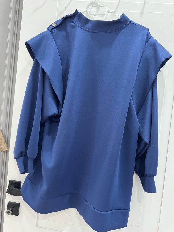 Parlak mavi renkli, uzun kollu, fırfırlı detaylara sahip, salaş kesim mini bluz. Sokak modasına uygun kısa uzunlukta.