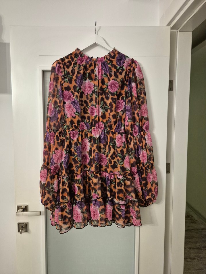 Uzun kollu, yüksek yakalı ve bol kesimli bu bohem mini elbise, fırfırlı tasarımı ve koyu çok renkli çiçekli-leopar desenleriyle romantik akşamlar için uygundur.