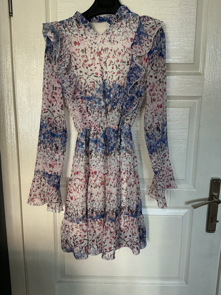 Bohem tarzda, yüksek yakalı ve uzun kollu mini elbise. Fırfır detaylı, bol kesim ve hafif çok renkli batik desenlidir, yumuşak sentetik kumaştan yapılmıştır.