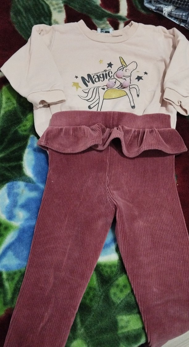 Bu bebek kız takımı, unicorn ve 'Magic' baskılı pastel pembe uzun kollu üst ile yumuşak kadife görünümlü fırfırlı pantolondan oluşur.