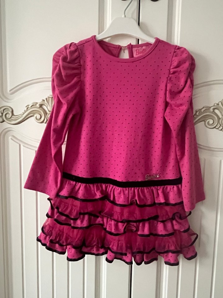 Uzun kollu, bisiklet yaka ve renkli baskılı desenli pembe kız çocuk elbisesi. Yumuşak ve sıcak kumaştan, klasik zarafet ile gotik stil birleşimi.