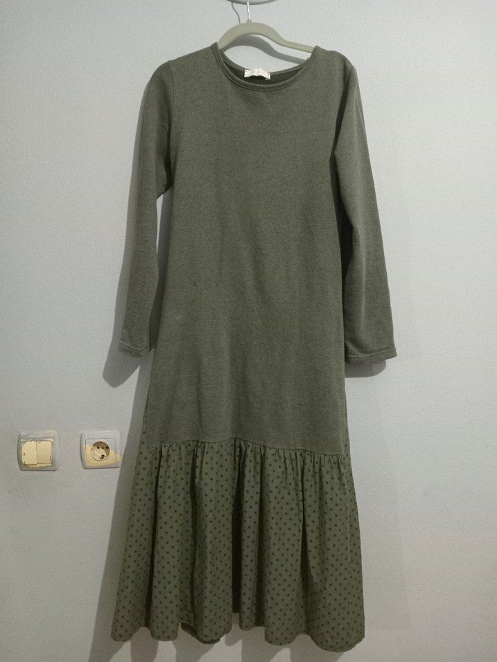 Salaş kesim, yuvarlak yaka ve uzun kollu uzun elbise. Fırfır detaylı, puantiyeli desenli, haki renkte ve yumuşak sentetik kumaştan yapılmıştır.