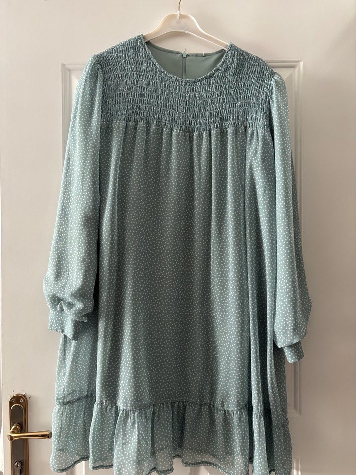 Uzun kollu, fırfırlı ve salaş kesim tunik. Yumuşak sentetik kumaştan, turkuaz renkte ve hafif desenli. Rahat yuvarlak yaka. Günlük kullanıma uygun, bohem tarzda.