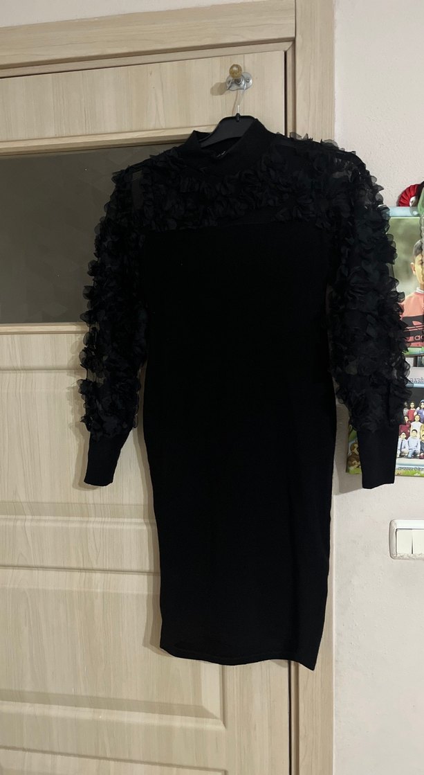 Bu siyah, vücuda oturan abiye elbise, uzun kollarda fırfır detayları yüksek yaka sayılı giyildi sıfırdan farksız 36-38 beden s-m beden uyumlu