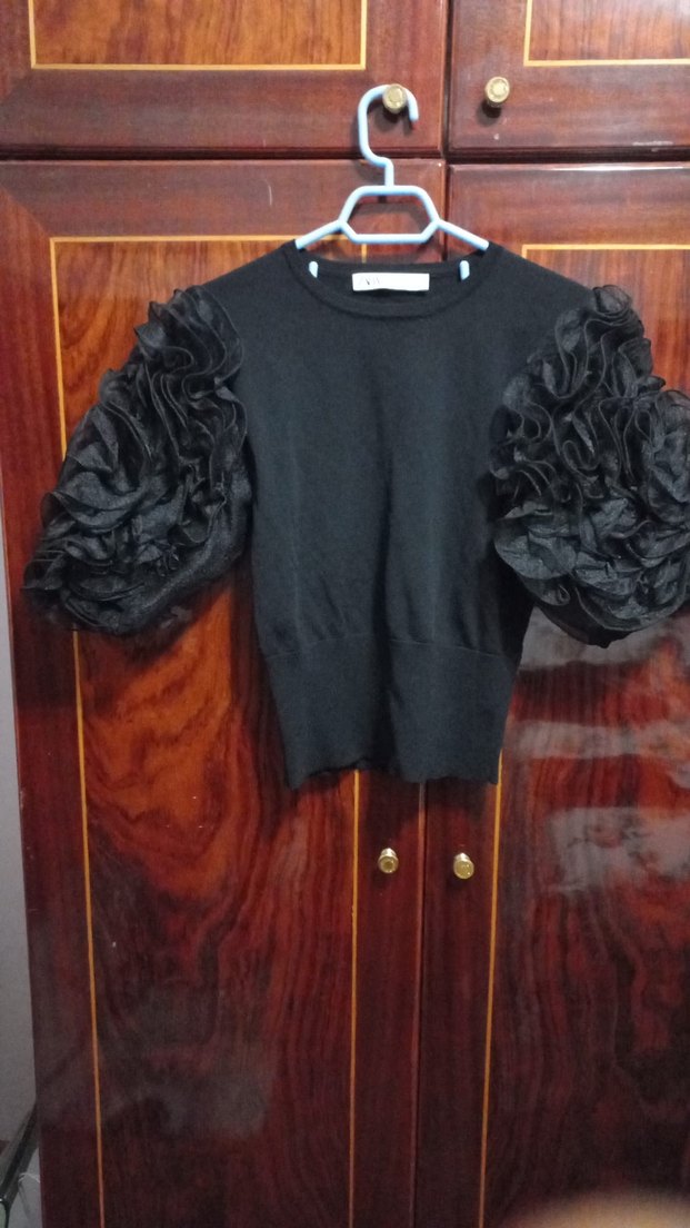 Dar kesim siyah bluz, uzun kollarda dramatik fırfırlar, yuvarlak yaka ve kısa boy ile gotik parti tarzına uygundur.