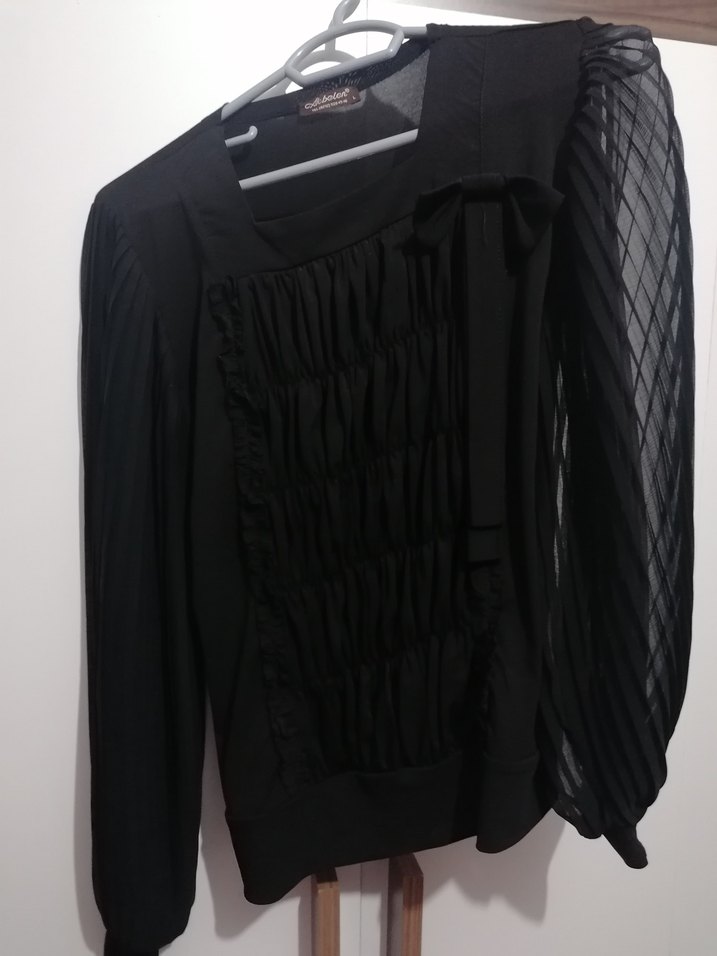 Bu siyah gotik bluz, uzun kolları fırfırlı ve transparan kumaşlı, sentetik materyalden yapılmıştır ve dar kesimlidir. Sıfır üründür. Çok hoş ve sk bir özel butik ürünüdür.. M bedendir. Kollar bol pile dökümlü tuldur.. Çok beğendiğim şık bir model. Beden bana uygun olmadığından giyemedim. Bayilicaniz bir taz ve model diyebilirim. Beden Vucuda oturur kaliptir. Likrali esnektir. Kollar valon dökümlü pileli tül dür. Bedeniniz 38 ise kacirmayin derim