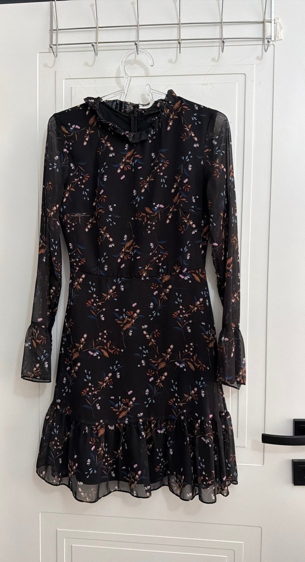 Uzun kollu, yüksek yakalı ve fırfırlı detaylı siyah midi elbise, zarif çiçek desenleriyle romantik akşamlar için uygun, trend goth tarzında.