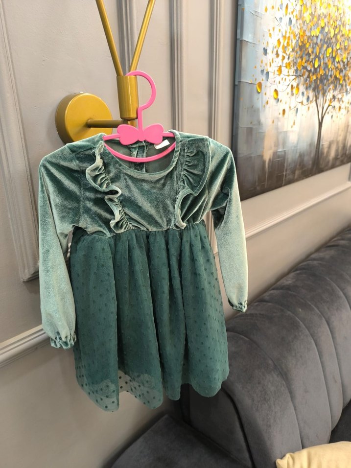 Turkuaz renkli kız çocuk elbisesi, uzun kollu ve fırfır detaylıdır. Salaş kesim, yuvarlak yaka ve yumuşak sentetik kumaşla bohem tarz sunar. Etek kısmı hafif puantiyeli tül ile katmanlıdır.
