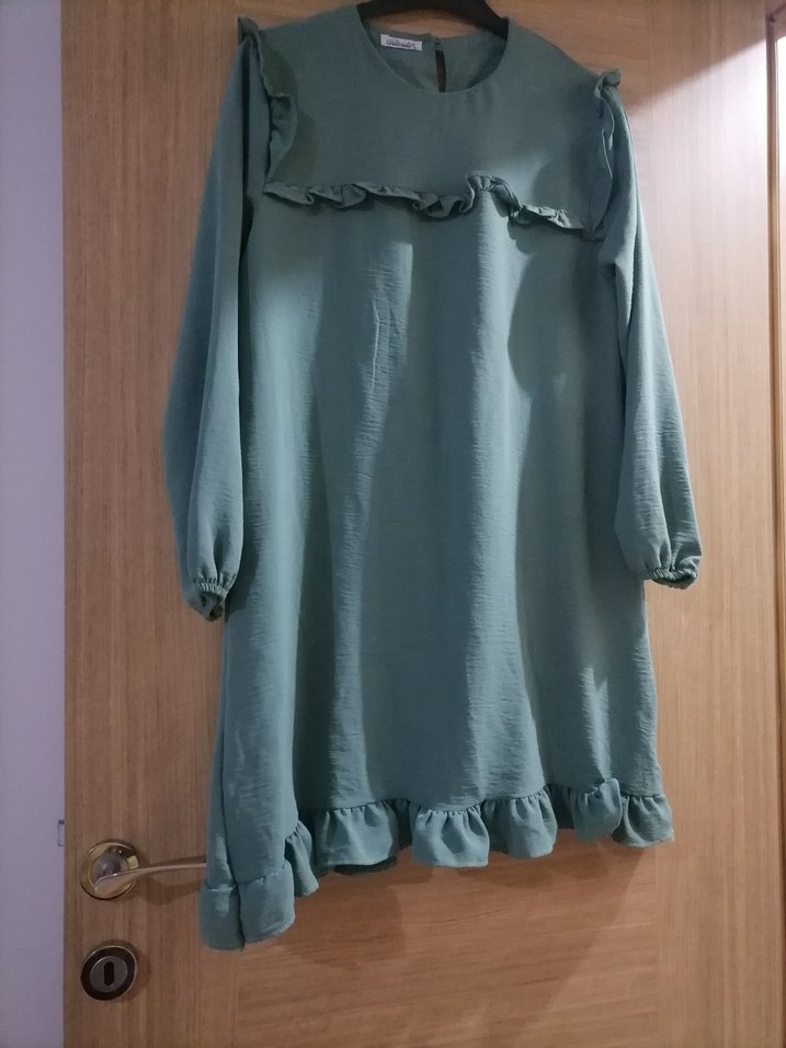 Uzun kollu, bol kesim tunik. Göğüs ve etek kısmında fırfır detayları bulunur. Yuvarlak yakalı, pastel turkuaz renkte, rahat kullanıma uygundur.