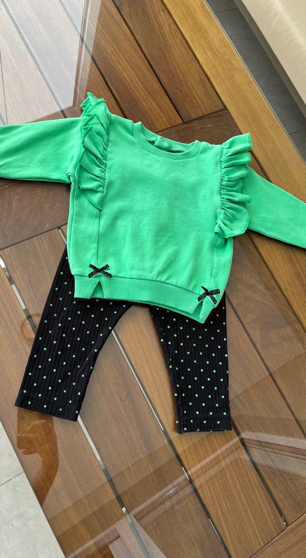 Uzun kollu yeşil üstü fırfır detaylı ve küçük siyah fiyonklarla süslenmiş, renkli puantiyeli siyah pantolonla tamamlanan bebek kız takımı.