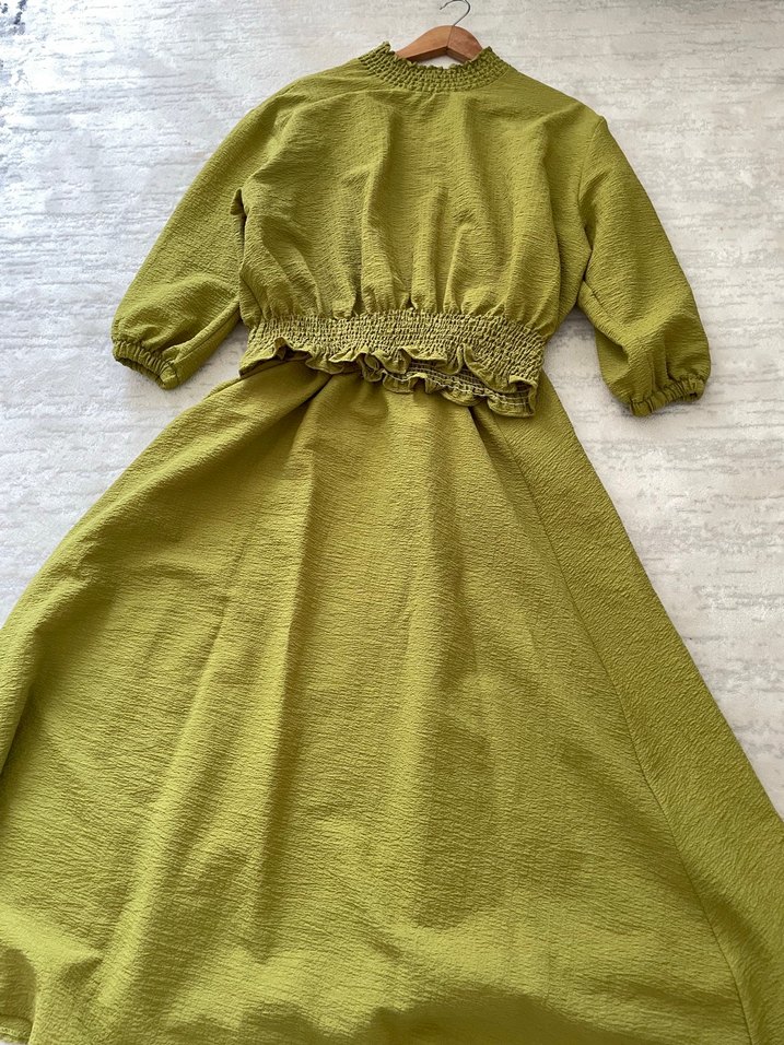 Uzun kollu, fırfırlı detaylara sahip yeşil keten elbise, salaş kesimi ve yuvarlak yaka ile günlük kullanıma uygundur.