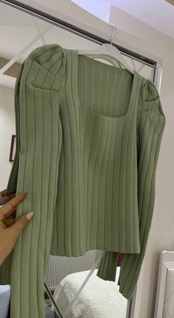 Haki renkli, uzun kollu ve bisiklet yaka fit kadın kazak. Örme dokusu ve midi normal boyuyla günlük rahat sokak stili için uygundur.