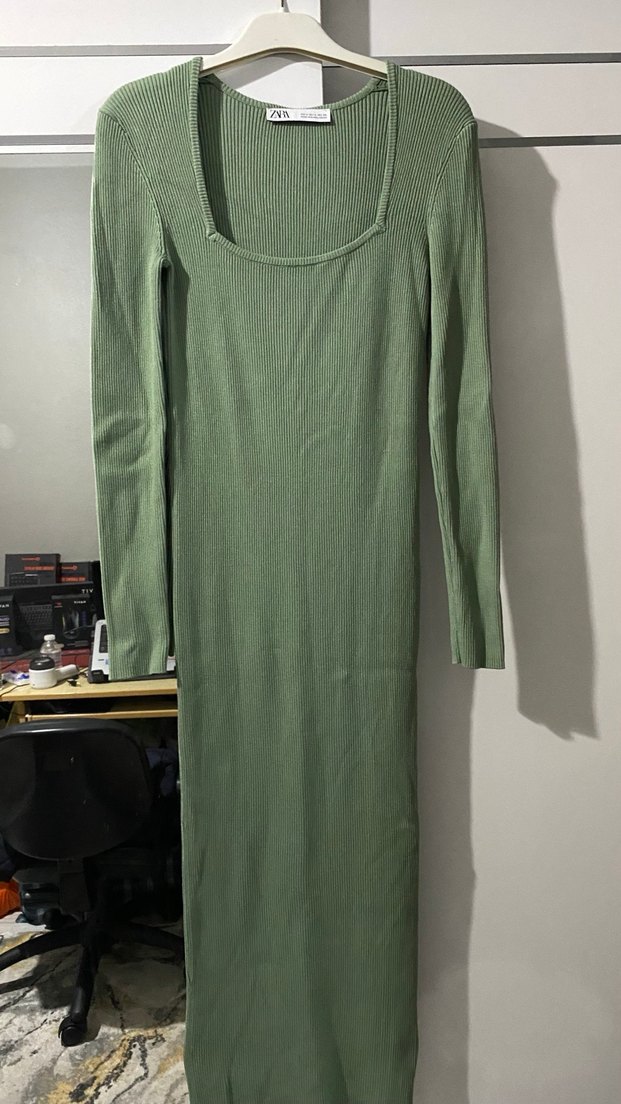 Uzun kollu, fitilli ve kare yakalı kadın elbisesi. Yumuşak sentetik kumaştan yapılmış,günlük rahat kullanım için uygun.