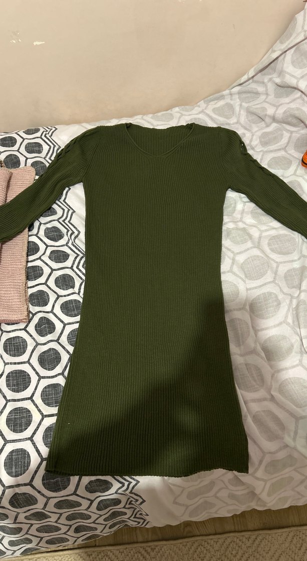 Uzun kollu, yuvarlak yaka, fitilli triko kumaştan yapılmış koyu yeşil kadın elbisesi. Rahat ve sade tarzıyla günlük kullanıma uygundur.