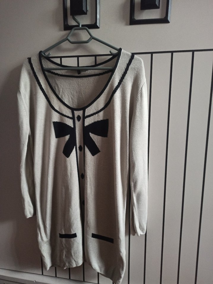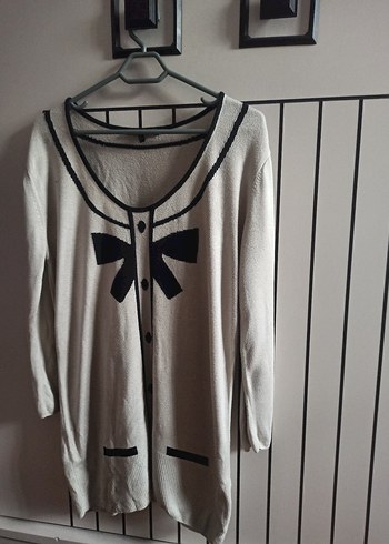 Bej renkte, uzun kollu, bol kesim triko bluz, fiyonk ve kontrast detaylarla günlük kullanıma uygundur. s- m için de uygundur.