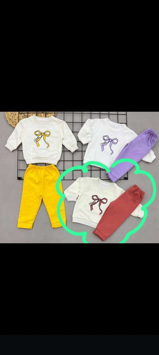 Uzun kollu, fiyonklu ve renkli desenli üstler, sarı, mor ve kırmızı canlı pantolonlarla kombinlenmiş bebek kız takımı. Rahat ve şık tasarım.