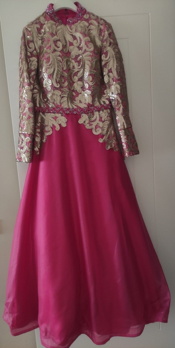 Uzun kollu, tekne yaka ve bol kesimli fuşya abiye, desenli ve parlak kumaşlı, düğünler için uygundur. Bir kere giyildi. Boyu 1.46 cm iki kol arası 46 cm hiçbir sorunu yoktur.
