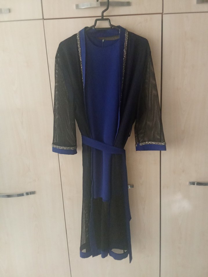 Uzun boy, gevşek kesim, uzun kollu, desen içermeyen koyu mavi renkli kadın sabahlığı. Avant-garde ve goth tarzlarının birleşimi.