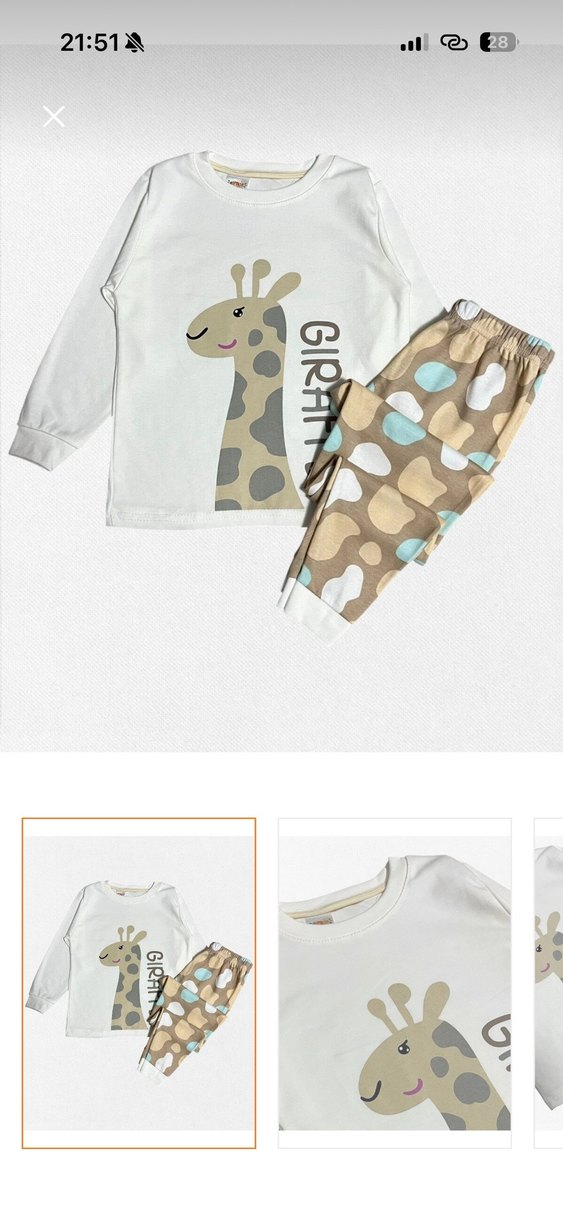 Uzun kollu beyaz üstte zürafa baskısı ve "GIRAN" yazısı bulunur. Düğmeli, bisiklet yaka ve yumuşak, sıcak kumaştan. Bej desenli pantolonla kombinlenmiştir. 3-4 yaş