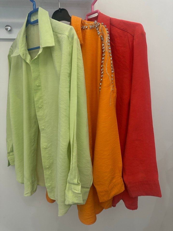 düğmeli, uzun kollu, yakalı ve bol kesim kadın gömleği. 3 gömlek fiyatıdır. 36-38 bedene uygun. Tane fiyatı 260 tl dir.