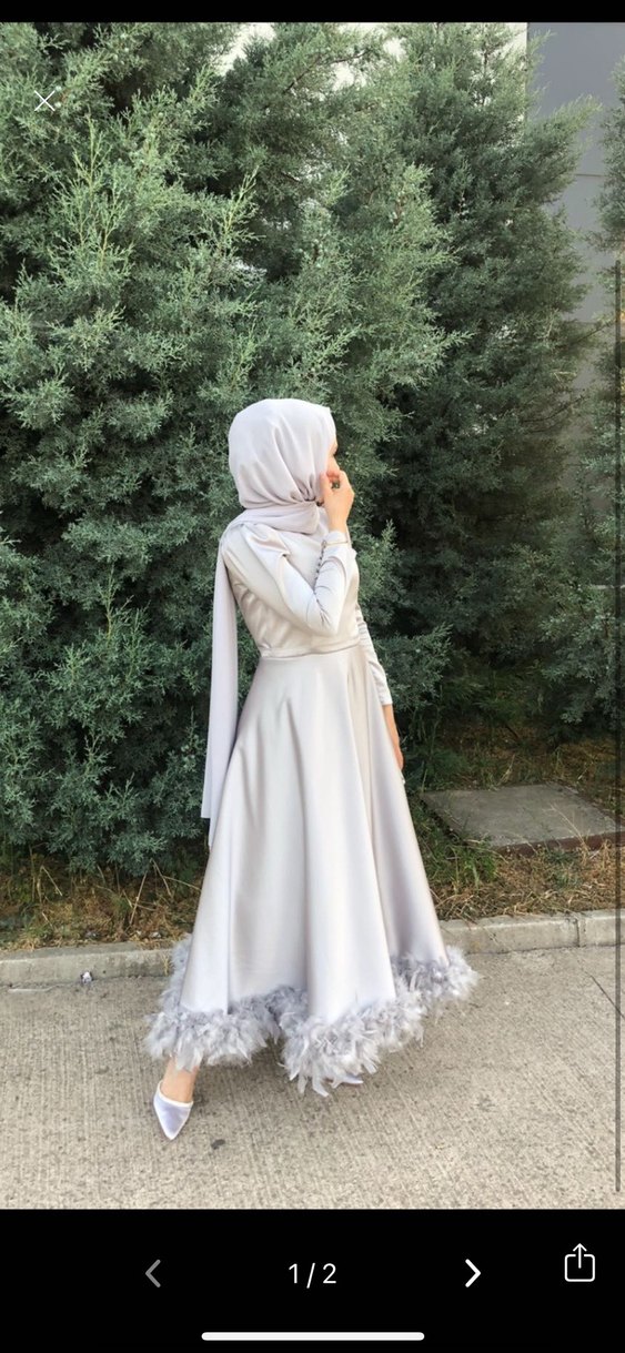 Uzun kollu, yüksek yakalı gri abiye elbise, drapeli ve etek ucu tüy detaylıdır. Düğünler için uygundur. Özel dikimdir. Rengi çok parlak değil. Sağlam durumda. Kabarık olsun diye içinde ekstra tül var.