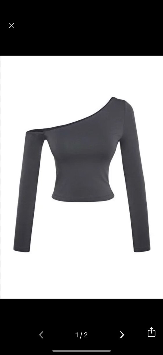 Gri renkte, uzun kollu ve asimetrik kesime sahip, tekne yaka bluz. Sade ve şık, günlük sokak stiline uygun.