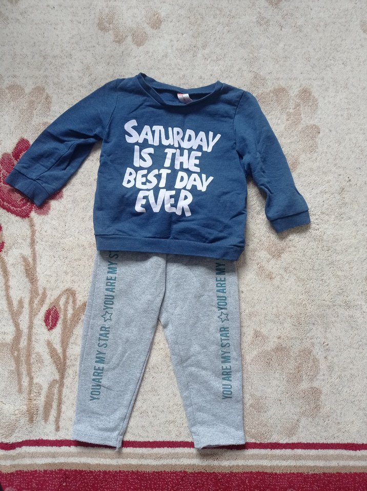 Uzun kollu lacivert üst kısmında "Saturday is the best day ever" baskısı bulunan, gri örme kumaştan yapılmış pantolonla tamamlanan erkek bebek takımı. Yuvarlak yakalı ve rahat kumaşlıdır.