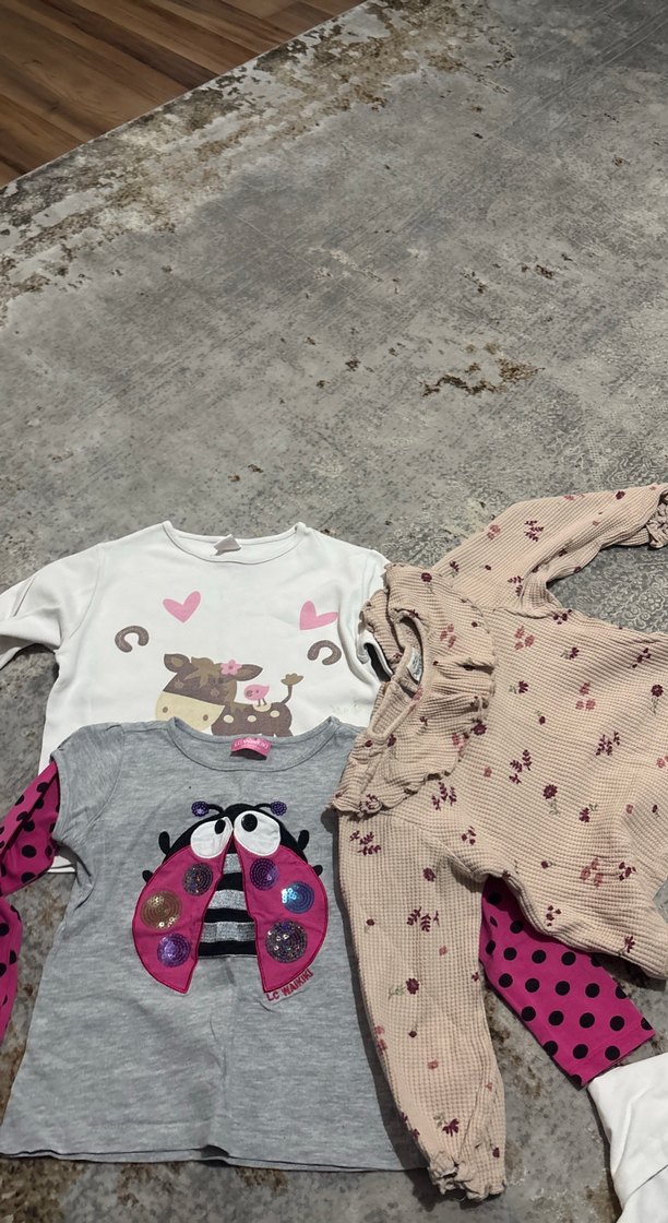 Bebek kıyafet setinde uzun kollu, gri ve bej tonlarında, baskılı hayvan ve kalp desenli örgü parçalar yer alıyor.