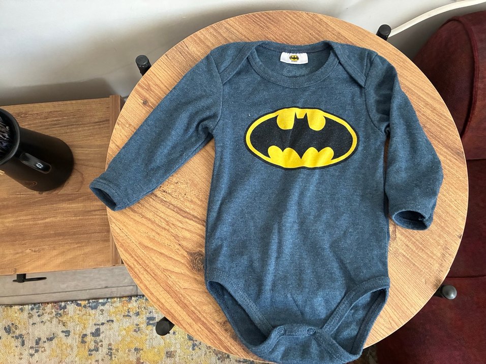 Gri renkte, uzun kollu bebek body, yuvarlak yaka ve baskılı Batman logosuna sahiptir. Düğmeli kapama ile kolay giyilir, yumuşak denim görünümlü kumaştan üretilmiştir.